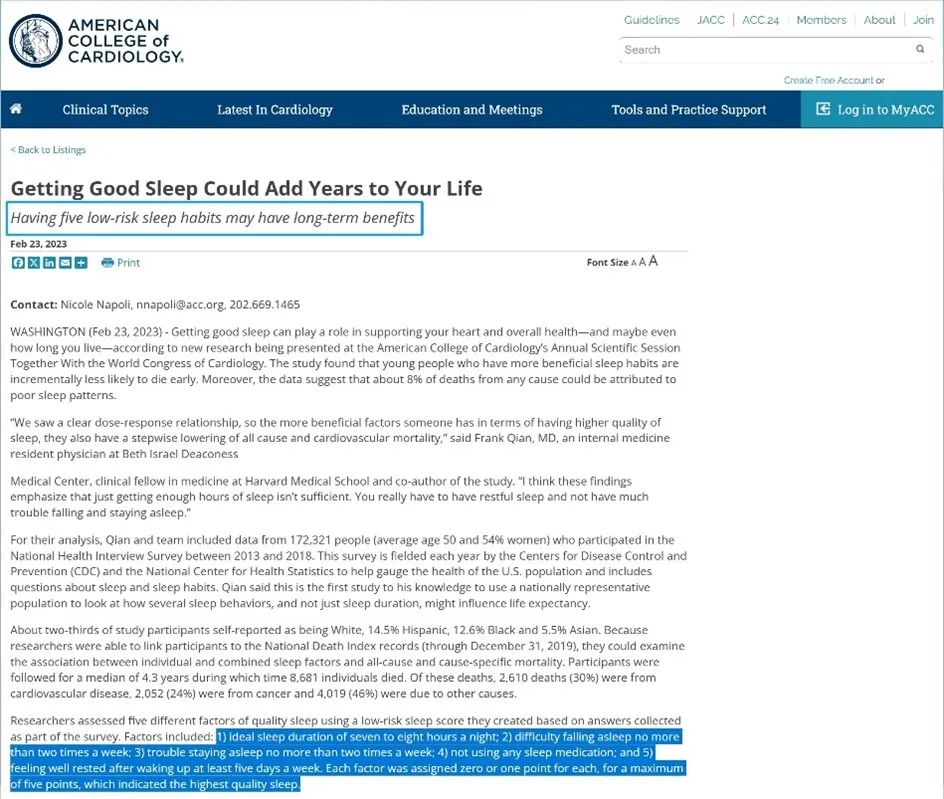 2023年美國心臟病學(xué)會(huì)(ACC)總結(jié)出了5個(gè)優(yōu)質(zhì)睡眠的“金標(biāo)準(zhǔn)”——