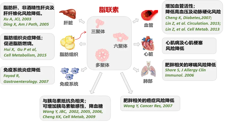 脂聯素(ADP)是由脂肪細胞分泌的、對人體有保護作用的特異性脂肪因子,是一種具有調節糖脂代謝、抗炎癥反應、抗動脈粥樣硬化等多重效應的脂肪細胞因子。